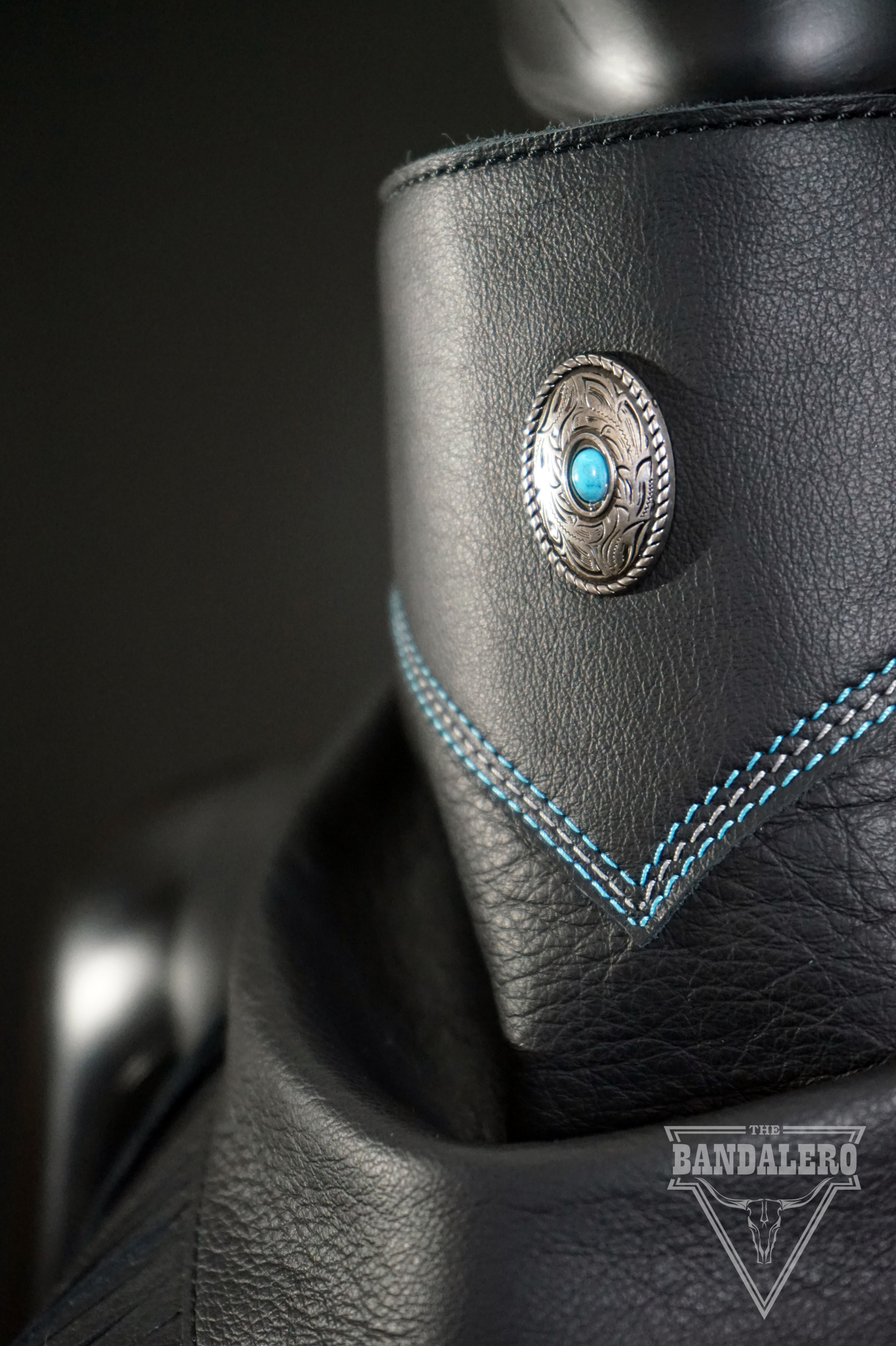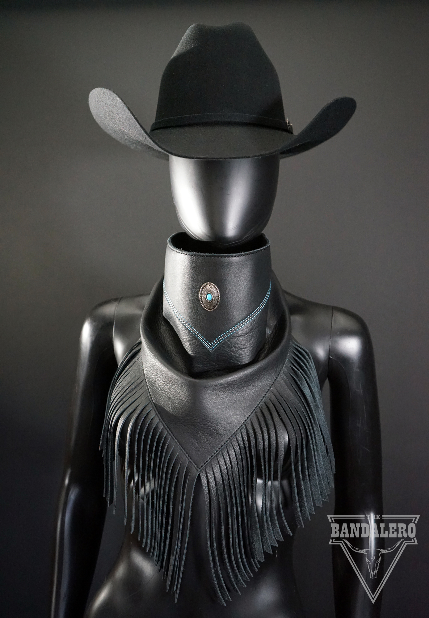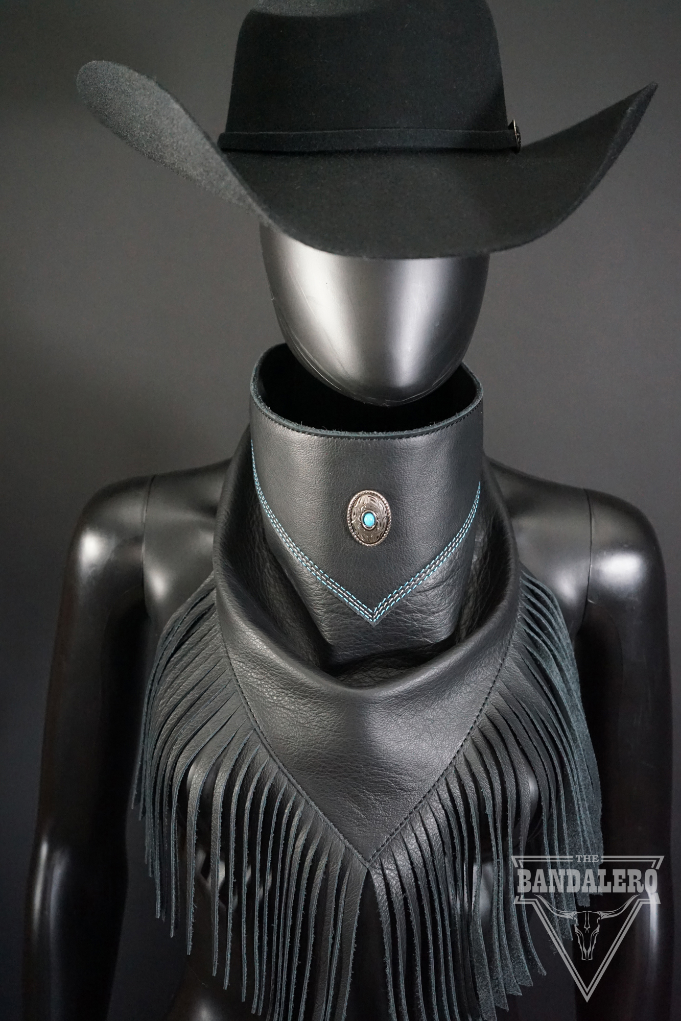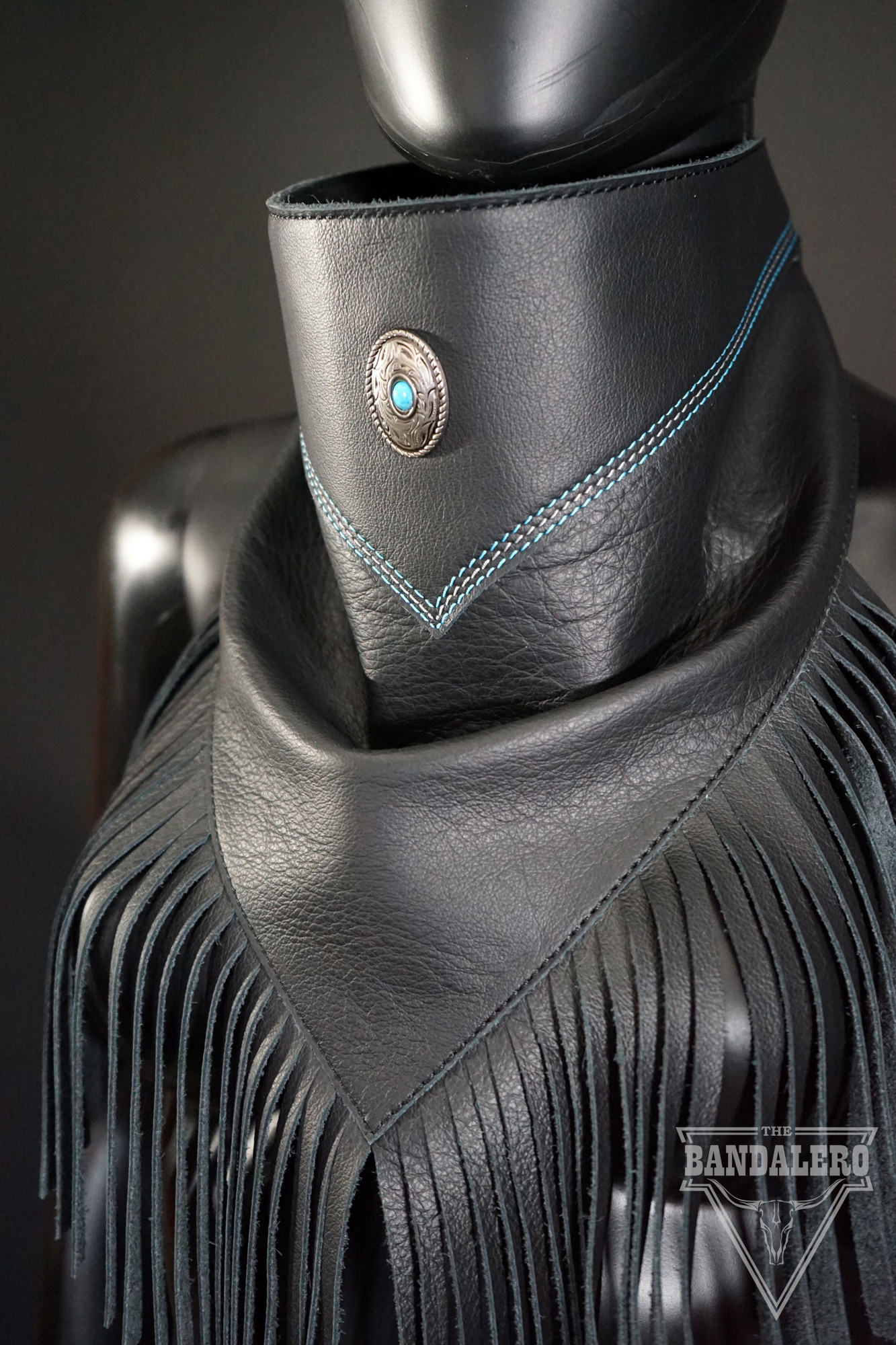 Black leather Bandalero with oval concho, accent blue/silver stitching and fringe.